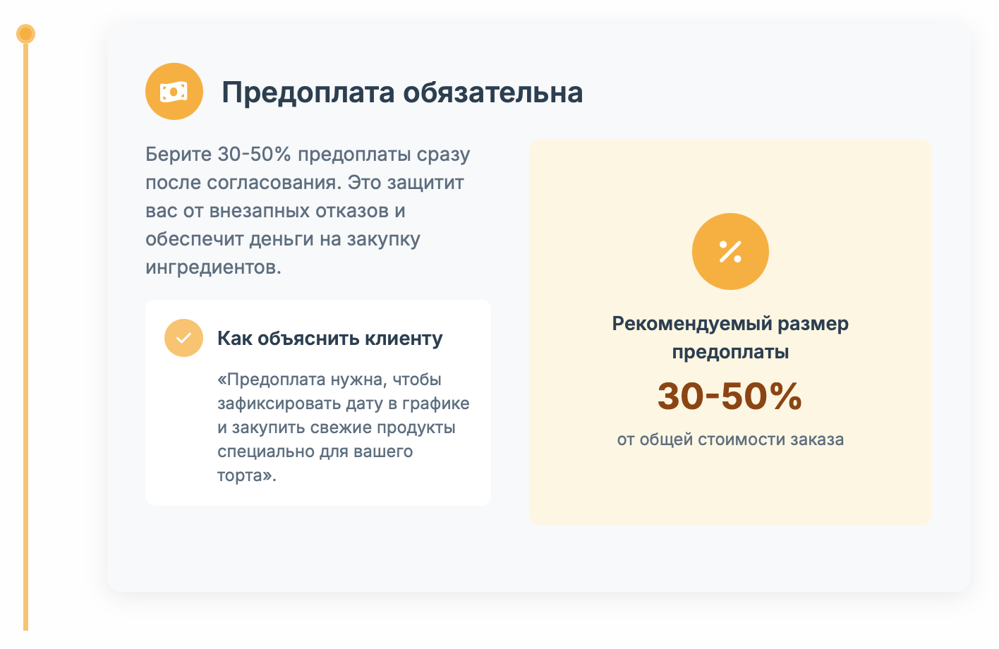 Объясняйте клиенту: «Предоплата нужна, чтобы зафиксировать дату в графике и закупить свежие продукты специально для вашего торта».