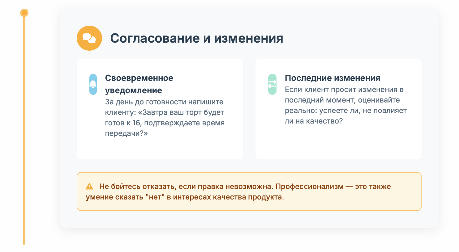Если клиент просит изменения в последний момент (другой цвет крема, добавить надпись), оценивайте реально: успеете ли, не повлияет ли на качество? Не бойтесь отказать, если правка невозможна.